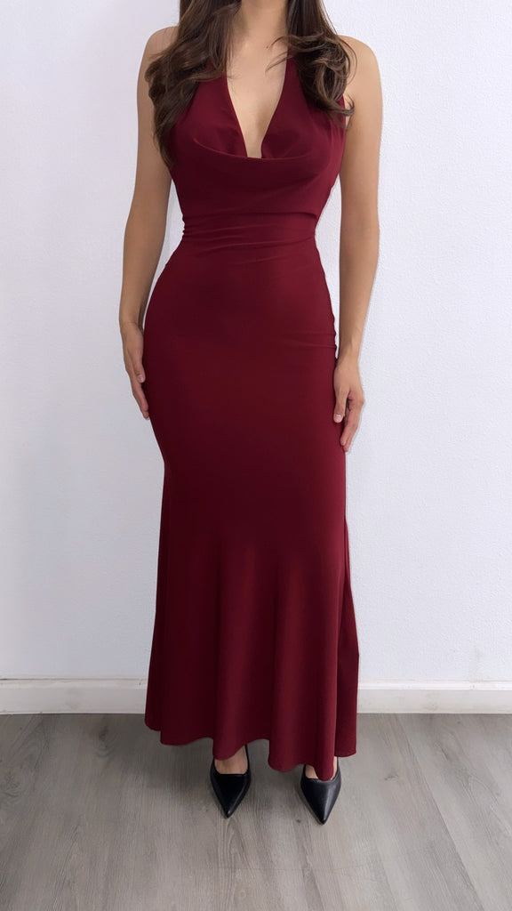 Holiday Spirit Mesh Halter Maxi Dress- Burgandy
