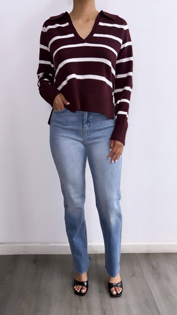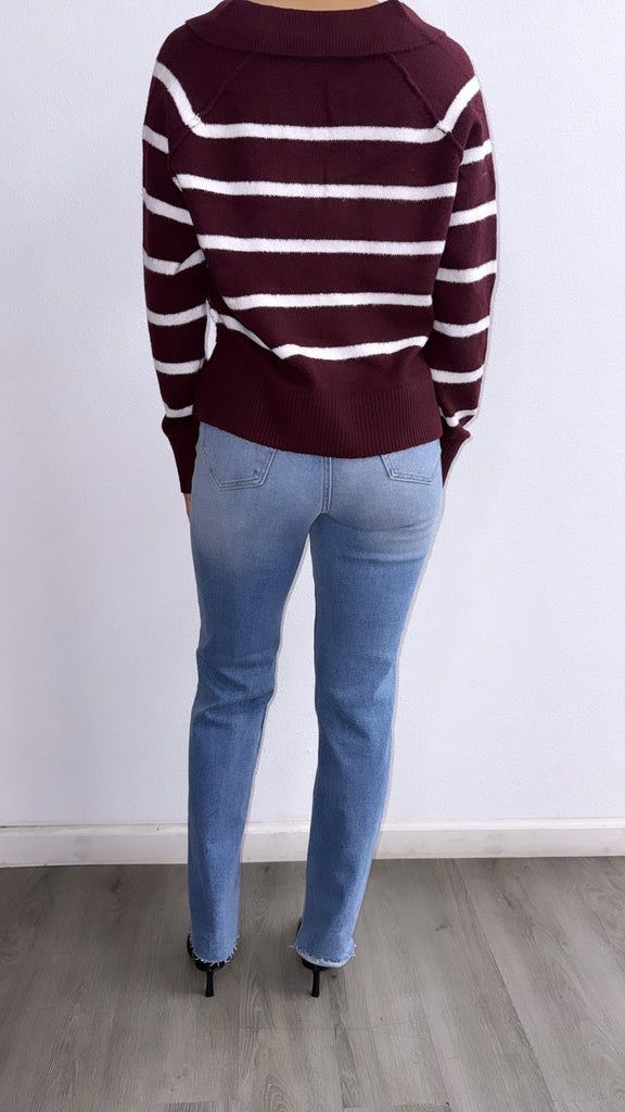 Janie Striped Oversized Sweater Top- Burgandy/White